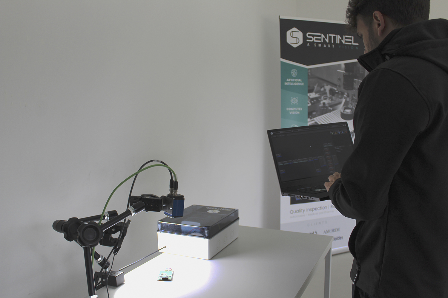 A Sentinel tem vindo a destacar-se com um software totalmente desenvolvido pela sua equipa e que é a base de todos os produtos que colocam no mercado, “esse software nasceu do empenho e dedicação extrema dos cofundadores nos primeiros meses de operação da empresa. O conhecimento que tínhamos neste tipo de tecnologia, permitiu-nos ser bastante assertivos nas primeiras soluções que oferecemos ao mercado.”, afirmou Joel Alves, o que lhes possibilita ter uma visão de futuro ambiciosa, como admitiu o cofundador da marca dizendo que “para os próximos cinco anos definimos diferentes estratégias, sendo que uma delas passa por sermos um fornecedor a nível mundial deste software. Acreditamos que este produto possa ser uma ferramenta essencial para clientes que automatizam fábricas pelo mundo inteiro. Este é um software que facilita a construção de equipamentos de teste automático e controlo de peças em linha de produção. Cada vez mais as empresas fazem peças com produção em série, e em grandes quantidades e cadência, o que dificulta terem operadores a fazer essa revisão do ponto de vista do controlo de qualidade da peça. O nosso software alia tecnologias como a Inteligência Artificial e Visão por computador, fazendo esse controlo de forma automática a 100% da produção” explicou Joel Alves.